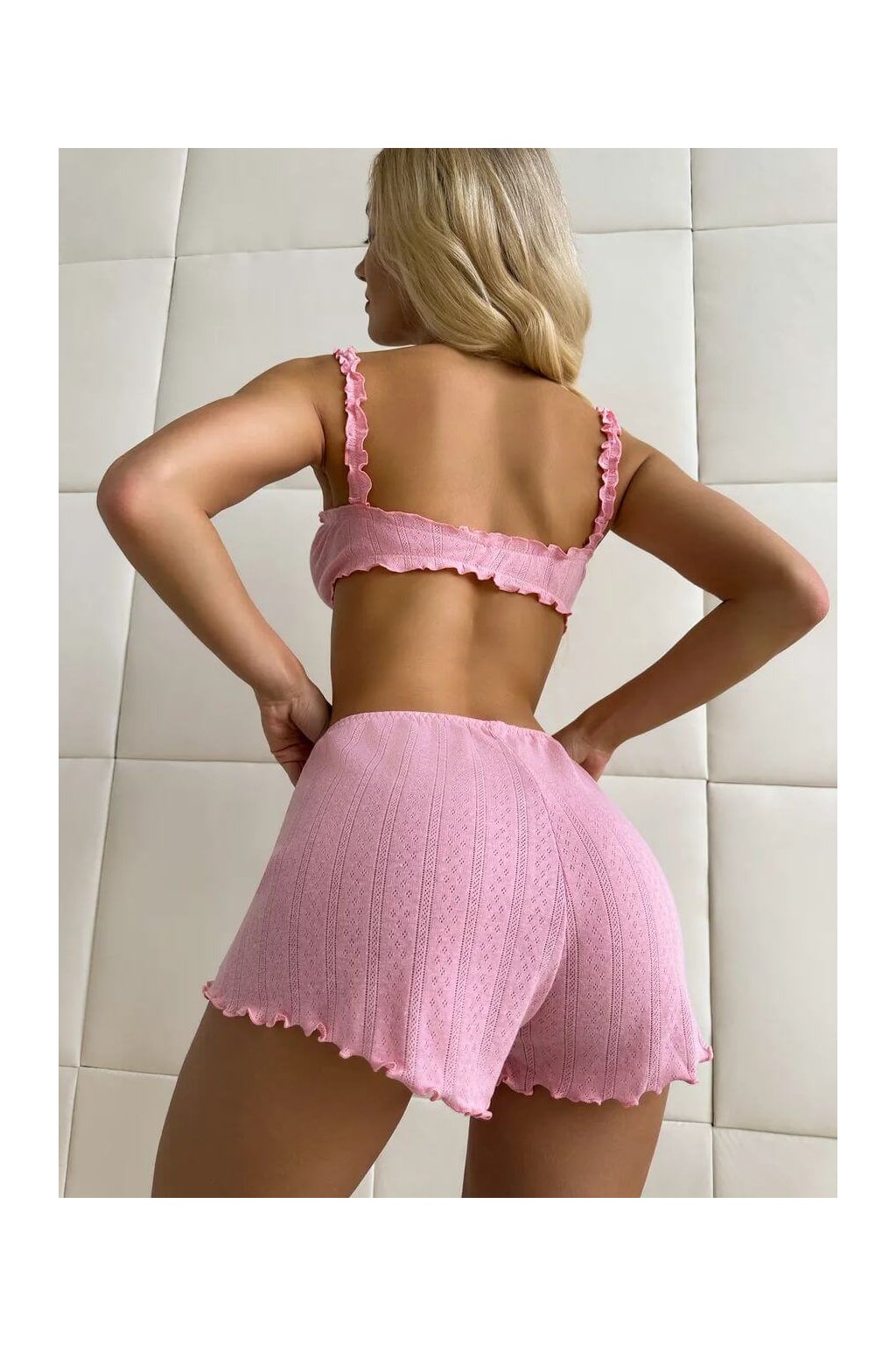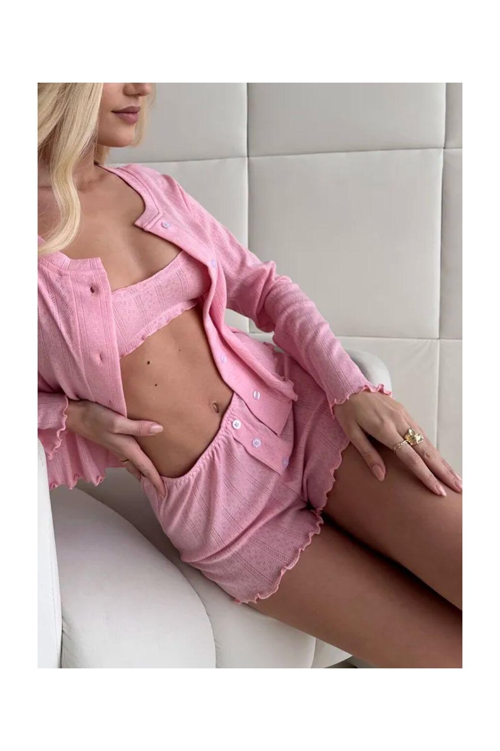 Objevte luxusní 3dílnou pyžamovou soupravu Melora, která kombinuje eleganci a pohodlí! Tato sada v krásném růžovém odstínu zahrnuje krátké kraťasy, stylovou podprsenku a lehký cardigan. Dokonalá volba pro relaxaci doma nebo noční odpočinek, ideální pro ženy, které hledají moderní a ženský vzhled. Pyžamová souprava je navržena s důrazem na kvalitu a pohodlí, nabízí vysokou prodyšnost, jemnou texturu a perfektní pružnost pro celodenní pohodlí. Snadná údržba a odolnost materiálu z ní dělají skvělý doplněk vašeho šatníku. Objednejte si soupravu ještě dnes a vychutnejte si luxusní pocit každý den!