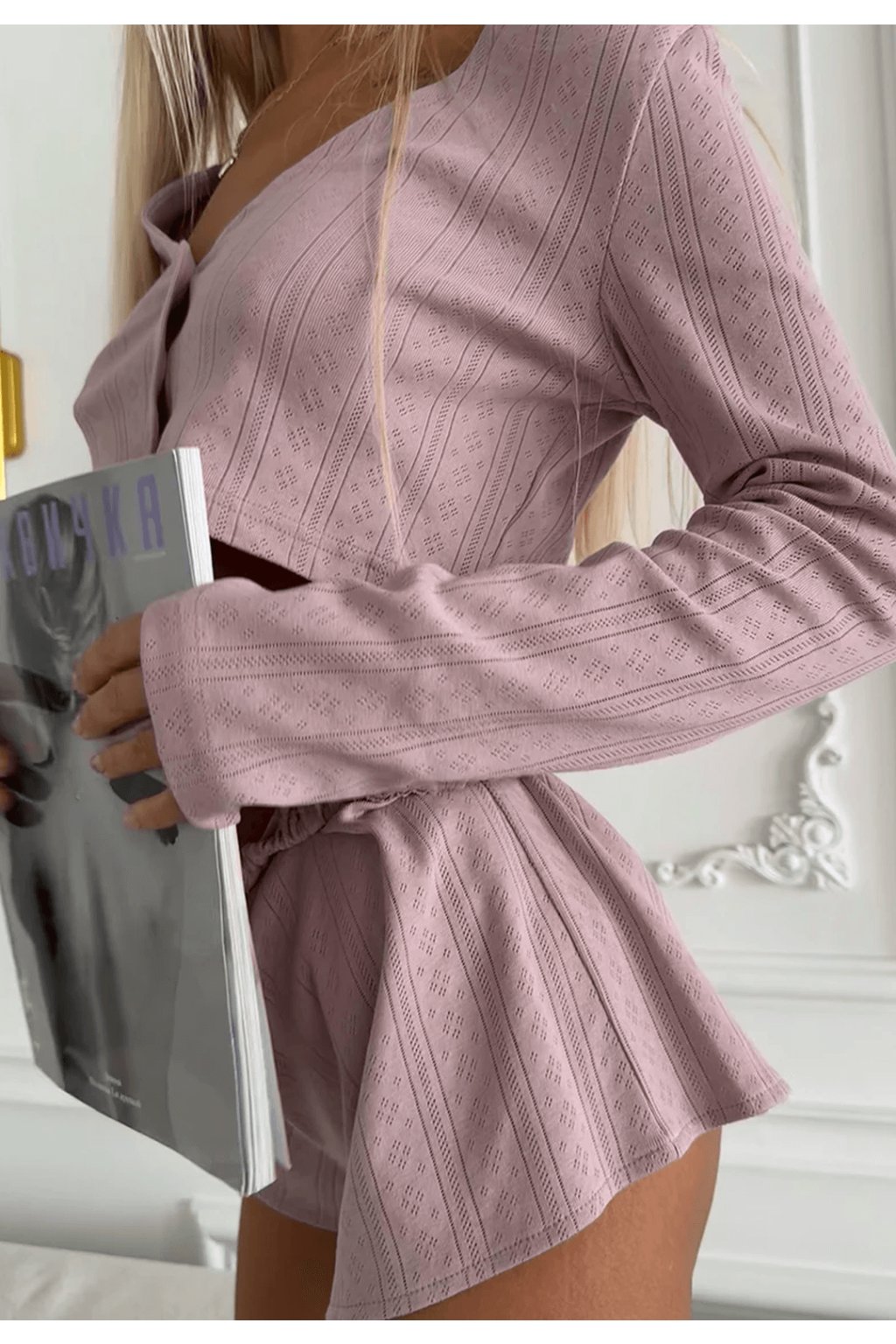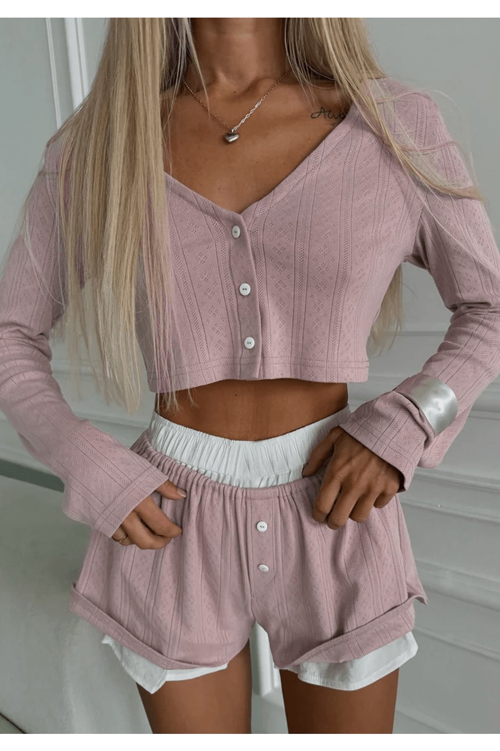 Objevte luxusní pyžamovou soupravu Nicole, která kombinuje eleganci a pohodlí! Tato sada zahrnuje krátké kraťasy a lehký cardigan. Dokonalá volba pro relaxaci doma nebo noční odpočinek, ideální pro ženy, které hledají moderní a ženský vzhled. Pyžamová souprava je navržena s důrazem na kvalitu a pohodlí, nabízí vysokou prodyšnost, jemnou texturu a perfektní pružnost pro celodenní pohodlí. Snadná údržba a odolnost materiálu z ní dělají skvělý doplněk vašeho šatníku. Objednejte si soupravu ještě dnes a vychutnejte si luxusní pocit každý den!
