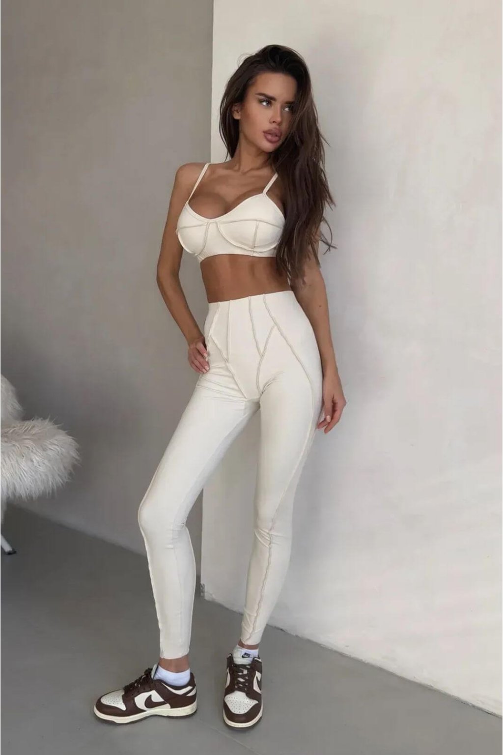 Obohaťte svůj sportovní šatník o sportovní set Seam v ivory barvě, který kombinuje stylové legíny a sportovní podprsenku. Tento sportovní set s vysokým pasem je navržen s konturovacími švy, které lichotí vaší postavě, zvýrazňují přirozené křivky a vytvářejí atraktivní siluetu přesýpacích hodin. Vyroben z prémiové směsi nylonu a spandexu, nabízí měkký, prodyšný a pružný materiál, který se přizpůsobí vašim pohybům – ideální pro posilovnu, jógu nebo každodenní nošení.