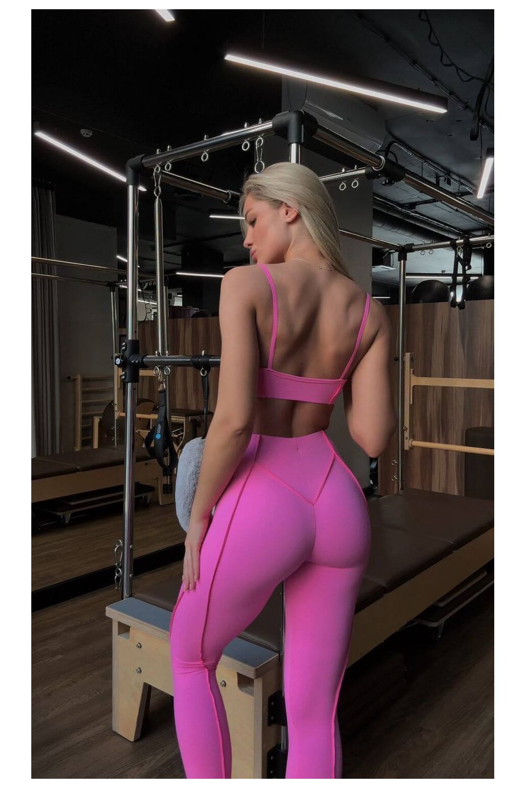 Obohaťte svůj sportovní šatník o sportovní set Seam v růžové barvě, který kombinuje stylové legíny a sportovní podprsenku. Tento sportovní set s vysokým pasem je navržen s konturovacími švy, které lichotí vaší postavě, zvýrazňují přirozené křivky a vytvářejí atraktivní siluetu přesýpacích hodin. Vyroben z prémiové směsi nylonu a spandexu, nabízí měkký, prodyšný a pružný materiál, který se přizpůsobí vašim pohybům – ideální pro posilovnu, jógu nebo každodenní nošení.